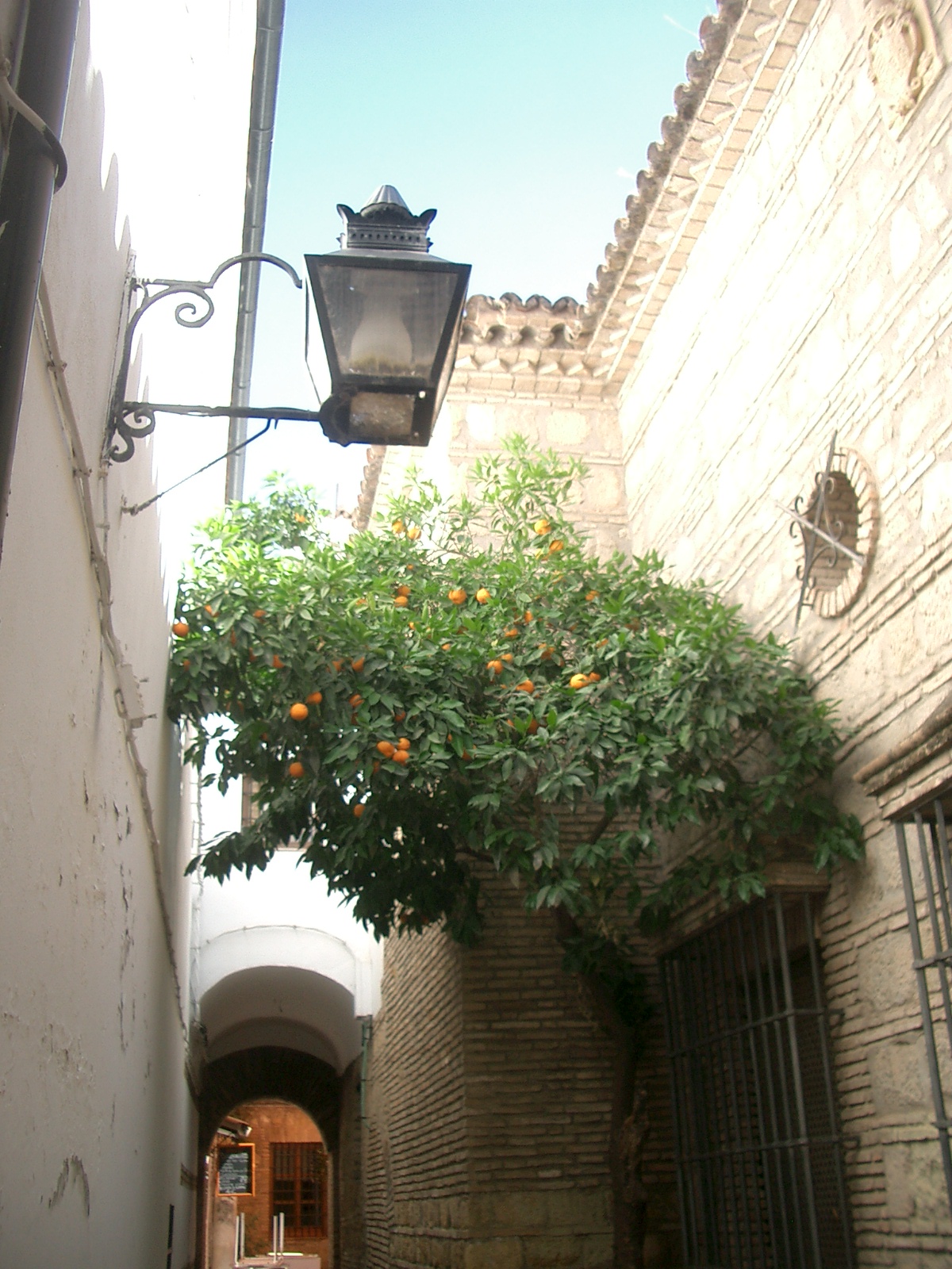 迷路のような小路に、上からオレンジの木がおおいかぶさります。